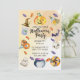Cette invitation Halloween présente une mise en page de style aquarelle avec diverses illustrations thématiques, notamment une citrouille sculptée en haut, des bonbons, des chauves-souris, une bouteille de potion, des crânes, un fantôme, un chaudron et d'autres icônes classiques d'Halloween disposés autour de la zone de texte. La section centrale contient des informations d'événement personnalisables telles que la date, l'heure, le lieu et les informations de RSVP, le tout sur un fond clair texturé qui met en valeur l'œuvre d'art.
