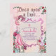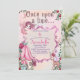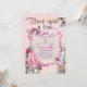 Cette invitation magique et enchanteresse à la fête d'anniversaire présente un thème de jardin de conte de fées mignon. L'expression "Il était une fois" est imprimée en haut dans une police fantaisiste. Une jolie fée aux cheveux roses et aux ailes qui volent en dessous. La partie inférieure présente une jolie petite maison de fée en bas à gauche et un cerf de bébé doux à droite.