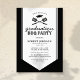 Jardin d'été bbq des invitations à la remise des diplômes avec un arrière - plan noir classique, un centre de remise des diplômes blanc, un casquette de mortier, des ustensiles de barbecue et un modèle de texte moderne facile à personnaliser. Sur le dos se trouve un motif rustique.