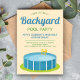 Éblouissez vos invités avec cette invitation à la fête d'anniversaire de la piscine mignonne avec une piscine de jardin cool avec une typographie vibrante sur un arrière - plan beige. Ajoutez simplement les détails de votre événement sur ce modèle facile à utiliser pour en faire une invitation unique. Retournez la carte pour révéler une texture d'eau bleue au dos de la carte.