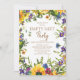 Fleurs sauvages colorés jaune, bleu et violet ressort couleur sur l'invitation de la partie de nid vide blanc avec une belle police de script de calligraphie. Le verso de cette carte est un floral assorti. Célébrez le départ de votre dernier enfant du nid avec une fête de nid vide. Contactez-nous pour obtenir de l'aide sur la personnalisation ou pour demander des produits correspondants.