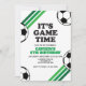 C'est l'heure du jeu ! Invitation de soccer à rayures vertes, noires et grises.