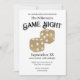 Ces invitations personnalisées pour des fêtes ont un thème de la nuit du jeu. Une image de jeu de dés est imprimée au centre dans un design de parties scintillant dorée. L'expression "Game Night" est imprimée au-dessus des dés avec un exemple de nom de famille. Vous pouvez personnaliser les invitations de parties de jeu pour inclure votre propre nom ou texte personnalisé.