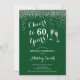Invitation du 60e anniversaire. Salutations À 60 Ans ! Design élégant en vert, blanc et argent. Il comprend des verres à champagne, des caractères de script et des confettis en argent parties scintillant. Idéal pour une soirée de soixantième anniversaire. Personnalisez avec vos propres détails. Peut être customisé pour montrer n'importe quel âge.