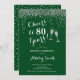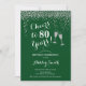 Invitation du 80e anniversaire. Salue À 80 Ans ! Design élégant en vert, blanc et argent. Il comprend des verres à champagne, des caractères de script et des confettis. Idéal pour une soirée coquette de quatre-vingts ans. Personnalisez avec vos propres détails. Peut être customisé pour montrer n'importe quel âge.