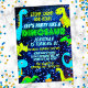 Présentant nos invitations d'anniversaire "Faisons la fête comme un dinosaure" dans des couleurs vives de néon, vert, bleu et jaune. Entrez dans un monde de couleurs vibrantes et de néons lumineux qui donneront instantanément le ton d'une fête épique avec des dinosaures mignons aux couleurs vives.