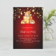 Une invitation à une fête de Noël. Arrière - plan de dégradé rouge. Décoré d'étoiles dorées et d'une pile de cadeaux. Personnalisez et ajoutez les détails. Texte blanc.