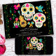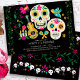 Invitation à la fête d'anniversaire du Jour des Morts avec des crânes à sucre fleuris, art folklorique mexicain et des bougies. L'occasion est indiquée dans une typographie décalée et le modèle est prêt à vous customiser avec vos détails. L'arrière de l'invitation a du lièvre et des guirlandes de fleurs. Consultez ma collection Dia de los Muertos pour trouver d'autres styles et articles correspondants.