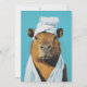 Portrait charmant et fantaisiste d’un capybara, le plus grand rongeur du monde, habillé en tenue spa. L'animal est drapé dans une serviette blanche avec un autre enveloppé autour de la tête, dressé contre un arrière - plan bleu apaisant. L’expression calme et sereine du capybara donne l’impression de profiter d’un moment de détente, ajoutant une touche d’humour et de chaleur à la scène. Le brossage détaillé met en valeur la fourrure du capybara et la texture douce des serviettes, faisant de cette oeuvre une pièce délicieuse et légère.