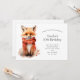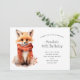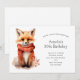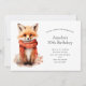 Invitation d'anniversaire avec une illustration d'un renardeau orange roux. Un sourire subtil sur son visage. Porte une belle écharpe rouge pour se réchauffer.