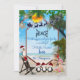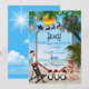 Une scène de vacances d'été chaleureuse sur la plage avec un Père Noël volant dans son traîneau disant Enseigner la Paix, et des manchots heureux, avec des chapeaux de Père Noël et un tout-petit pour une carte de vœux à personnaliser.