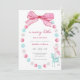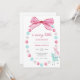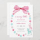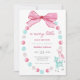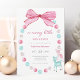 Cette invitation à la douche pour bébé "Joyeux Petit Noël" présente un design festif et délicat avec une palette de couleurs pastel de roses, bleus et blancs. Un arc en forme d'aquarelle rose fantaisie en haut et une bordure de billes pastel ressemblant à des ornements de Noël encadrent la carte. Deux cerfs de bébés mignons ornent le coin inférieur droit, ajoutant une touche douce et saisonnière. Le design combine magnifiquement la joie de Noël avec une ambiance douce et accueillante pour une douche bébé fille.