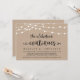 Belles lumières de chaîne de ferme rustique modernes, police de script noir sur fond de papier kraft, annonce de mariage en fuite, carte d'invitation (La célébration continue). C'est parfait pour votre réception de mariage et votre soirée de célébration post-mariage. Ajoutez vos détails dans la même police / lettrage.