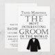 C'est son dernier tour de piste avant de se ranger ! Pourquoi ne pas lancer les festivités avec une invitation drôle et cool qui fait savoir à tous les gars que l'invité d'honneur est...le marié le plus intéressant du monde ! Cette invitation de l'enterrement de vie de garçon "Marié le plus intéressant" en noir et blanc présente un design de texte gras et un smoking élégant. Facile à personnaliser, il suffit d'ajouter les détails de la fête débridée que vous avez prévue dans les champs prévus. Cliquez sur le bouton "Personnaliser" pour trouver des options de personnalisation supplémentaires.