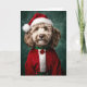 Cette image présente un adorable Labradoodle habillé d'une tenue de Noël festive. Le chien porte un chapeau de Père Noël rouge avec une garniture blanche moelleuse et un manteau de velours rouge assorti aux accents de fourrure blanche. Autour du cou, un collier vert avec une étiquette rouge en forme de patte. La fourrure bouclée et les yeux expressifs du Labradoodle lui confèrent un look attachant et chaleureux, capturant parfaitement l’esprit de vacances contre un arrière - plan vert tendre.