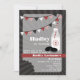 Une invitation à l'anniversaire illustrant une bouteille de lait avec paille rayée rouge et blanche et deux biscuits sandwich au chocolat. L'invitation présente également des modèles de chevrons et de bunting massif et de sunburst. Le Arrière - plan a "mordant" en bas à gauche. Personnalisez le texte.
