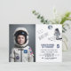 Un magnifique astronaute moderne dessiné à la main qui surplombe une planète sur une invitation photo d'anniversaire d'un garçon arrière - plan blanc. Le compte à rebours a commencé 3,2,1 Blast off! Remplacez l'exemple de photo par le vôtre.