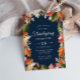 Cet invitation de célébration a un feuillage coloré et un arrière - plan bleu marine. Les couleurs et autres caractéristiques de cet invitation de dîner d'action de grâce peuvent être personnalisées.