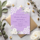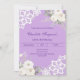 Arrière - plan de couleur lavande décorée de fleurs blanches, de roses et de dentelle blanche. Personnalisez et ajoutez votre nom et vos détails. Texte mauve.