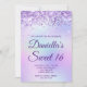 Créez votre propre invitation à célébrer le 16e anniversaire pour votre fille. Les graphiques de parties scintillant de lavande brillante de décoration forment une bordure supérieure. L'art numérique arrière - plan présente une feuille de style arc-en-ciel irisée et légère. Customisez l'invitation couleur de texte royal violet ou styles de police. Le texte "Sweet 16" est également personnalisable. Les scintillants de luxe, la parties scintillant et la feuille seront créés avec des éléments artistiques qui s'impriment comme une photo.