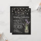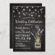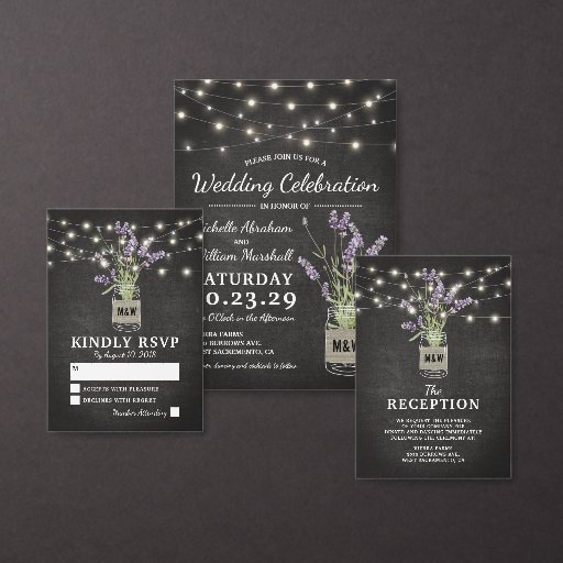 Immergez vos invités dans le charme enchanteur de votre mariage campagnard avec nos belles invitations. Ces invitations de mariage rustiques et chic mêlent parfaitement un arrière - plan de tableau noir rustique à de délicieuses lampes à cordes pour une touche captivante. Le chef-d'oeuvre est une bocale de maçon qui déborde de fleurs de lavande violette, enveloppée de burlap et emblazée avec les initiales du couple. Un modèle mariage facile à personnaliser ajoute la touche finale à ces invitations uniques.