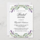 Un arrière - plan blanc. Décoré de fleurs de lavande violette et de verdure d'eucalyptus. Personnalisez et ajoutez un nom et des détails du parti. Le nom est écrit avec un script de style manuscrit