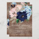 Le beau bleu marine, rougissent et l'invitation nuptiale de douche de fleurs bleues poussiéreuses avec une police moderne de calligraphie réglée sur un arrière - plan en bois rustique. renversez notre invitation de wedding shower de regarder plus d'un dos floral coordonné de bleu marine pour un contact spécial supplémentaire. Facile à personnaliser avec votre information de partie.