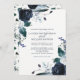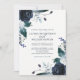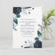 Cette invitation de mariage branchée et élégante présente des fleurs de pivoines bleu marine à l'aquarelle, des feuilles luxuriants, des baies et des plumes sur un arrière - plan blanc.