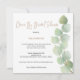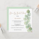 Style minimaliste avec une élégante branche de feuille d'eucalyptus qui court sur le côté droit, avec typographie à gauche. Drive By Bridal shower est placé dans un script moderne, et le reste du texte que vous pouvez facilement personnaliser. Vous pouvez également modifier la couleur de l'arrière - plan vert de coordination au verso si nécessaire. La carte de carré apporte une touche contemporaine.