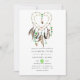 Faire-part de mariage tribal amérindienne avec un attrapeur de rêve avec des plumes et des pierres émeraude éblouissantes.