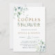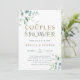 Cet mariage couple une invitation à la douche avec des eucalyptus peints d'aquarelle et des feuilles verts avec des lettres botaniques vert et or.