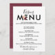 Ce menu de baiser à lettre fleurie marron est parfait pour une réception de mariage d'automne. Le design présente un petit bouquet de fleurs bordeaux et pêche sur une typographie grasse pour un look moderne et élégant. Le dos présente des coups de pinceau aquarelle marsala.