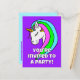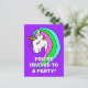 Ce design de fête amusant présente une couleur de fond vive et une licorne heureuse avec une crinière arc-en-ciel. Personnalisez avec votre propre nom, âge et informations !
