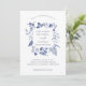 Cette belle et élégante faire-part de mariage botanique présente un cadre branché plein de feuilles bleus sur un arrière - plan blanc.