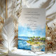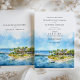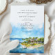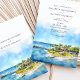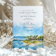 Transportez vos invités dans un paradis tropical avec ce faire-part de mariage d'aquarelle à couper le souffle. Le design illustre à merveille un luxueux complexe Florida Keys, avec ses palmiers balançoires, ses eaux turquoise cristallines et son ambiance côtière. La typographie élégante et classique est sertie contre un doux lave bleu aquarelle, complétant parfaitement la belle scène de plage ci-dessous. Cette invitation est idéale pour un mariage de luxe, une cérémonie de plage chic ou toute célébration sur le thème de la côte. Tout le texte est un modèle entièrement personnalisable, vous permettant d'ajouter facilement vos détails personnels de mariage.