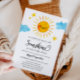 Carte d'invitation baby shower mignonne avec aquarelle illustrant un soleil souriant avec étoiles et nuages. Le texte dit : "Un petit rayon de soleil est en route." Conception neutre pour le genre.