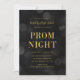 Invitation pour le bal de promo élégante avec les mots "Prom Night" en faux feuillet d'or sur un fond à motif de lumières bokeh foncées. L'invitation a un verso à fond foncé.