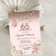 Une invitation moderne, chic et glamour avec une élégante tiare dorée, des lampes à cordes, des papillons de parties scintillant et des fleurs roses.