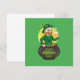 Invitation avec une illustration d'un lutin souriant portant un costume vert, un nœud papillon et un chapeau melon assis à l'intérieur d'un pot d'or et tenant un verre de bière, avec un arc-en-ciel jaune, vert et orange en arrière-plan.
