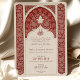 Entrez dans un monde d'élégance intemporelle avec ce luxueux faire-part de mariage, combinant astucieusement un rouge rubis profond avec les tons sereins de la crème. Cette magnifique invitation est un chef-d'oeuvre de la conception islamique, avec des motifs en dentelle complexes qui s'inspirent des motifs riches et de la géométrie inhérente à l'art islamique. Le devant est orné d'un étonnant étalage de feuillage entrelacé et de motifs floraux dans la crème dressée contre un arrière - plan en rubis dynamique, magnifiquement encadré par une arche ornementale. L'arrière de l'invitation fait écho au motif élaboré, offrant une toile complète pour des détails supplémentaires sur l'événement ou un message personnalisé aux invités. Cette invitation est l'incarnation de l'opulence et de la tradition, parfaite pour un couple célébrant leur union avec un clin d'oeil à la magnificence culturelle.