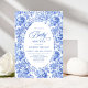 Create a timeless first impression with this baby shower invitation featuring elegant French toile de jouy roses in refined shades of navy blue, royal blue, dusty blue, and deep blue, inspired by classic chinoiserie floral design. This sophisticated style blends heritage elegance with modern charm, making it perfect for a memorable baby shower celebration.