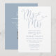 Ce faire-part de mariage de script minimaliste bleu poussiéreux peut être personnalisé avec vos informations en typographie chic avec les détails de votre site mariage et votre code QR au verso. Conçu par Thisisnotme©