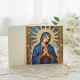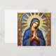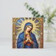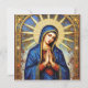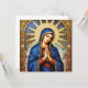 "Ce dessin exquis représente un portrait de la Vierge Marie réalisé dans un style de mosaïque riche et détaillé. Elle est représentée avec une expression sereine, les yeux fermés en prière, et les mains jointes. Elle est drapée dans un manteau bleu foncé orné de garnitures dorées et d'étoiles, sur un fond en forme d'arche représentant un soleil rayonnant et un ciel étoilé. La texture complexe de la mosaïque et les accents dorés donnent à l'image un sentiment de grandeur sacrée et d'art intemporel. Ce dessin convient parfaitement aux produits ayant un thème religieux, historique ou d'art classique. Imaginez-le sur des icônes religieuses, des objets de dévotion, des impressions d'art encadrées ou du papier à lettres élégant."