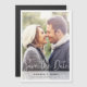 Ce mariage photographique moderne et simple, à l'exception de la carte magnétique datant, présente un design épuré et minimaliste. Il comporte des bordures blanches pour encadrer votre photo préférée, ainsi qu'une couche semi-transparente au bas de la photo où sont notés vos prénoms, date et emplacement mariage. Notez la ponctuation que nous avons utilisée pour votre date et votre emplacement-nous n'avons pas inclus une virgule dans les détails de la date, mais nous l'avons fait avec la date. Vous pouvez modifier n'importe quelle ponctuation ou format de cette information pour qu'elle corresponde à votre propre style. Vous pouvez également choisir de remplacer le "+" entre vos noms par "&" ou "and". Juste au-dessus de cette info, et en fait en y plongeant légèrement, nous avons ajouté un texte moderne et animé Save the Date dans un blanc immaculé et élégant. Utilisez les outils de design intuitifs, votre photo préférée et votre inspiration pour faire de ce mariage simple et moderne sauver la carte magnétique de la date uniquement la vôtre!