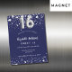 Une carte magnétique d'invitation moderne, élégante et glamour pour une Sweet 16, 16e anniversaire. Un arrière - plan bleu marine, décoré de faux étoiles argentées. Personnalisez et ajoutez votre nom et les détails de votre fête. Le numéro 16 est écrit avec une police de style ballon.