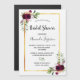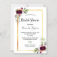 Devant : Un arrière - plan blanc avec un cadre en faux or. Décoré de fleurs bordeaux foncé, de roses, de plumes de style boho et de verdure. Personnalisez et ajoutez le nom de la mariée à être et les détails du parti. Peut également servir à enregistrer le rappel de date pour les invités.