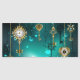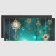 Or, clés antiques avec engrenages et cadrans accrochés sur chaînes dorées sur arrière - plan vert lumineux.