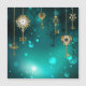 Or, clés antiques avec engrenages et cadrans accrochés sur chaînes dorées sur arrière - plan vert lumineux.