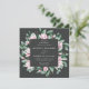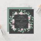 Elégantes invitations de mariage florales avec vos détails mariages entourées d'un cadre géométrique de fleurs de magnolia rose aquarelle et feuilles d'eucalyptus vert contre un arrière - plan au charbon de bois. L'envers des invitations de mariage carrés est doté d'un solide arrière - plan vert eucalyptus. Conçu pour coordonner avec notre collection de mariages Magnolia & Eucalyptus.