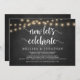 Maintenant célébrons, Carte d'annonce / invitation de mariage en fuite, dans un tableau noir de ferme rustique, conception de lumières de chaîne. C'est parfait pour votre réception de mariage et votre fête de célébration après le mariage. Ajoutez vos coordonnées dans la même police / lettrage.